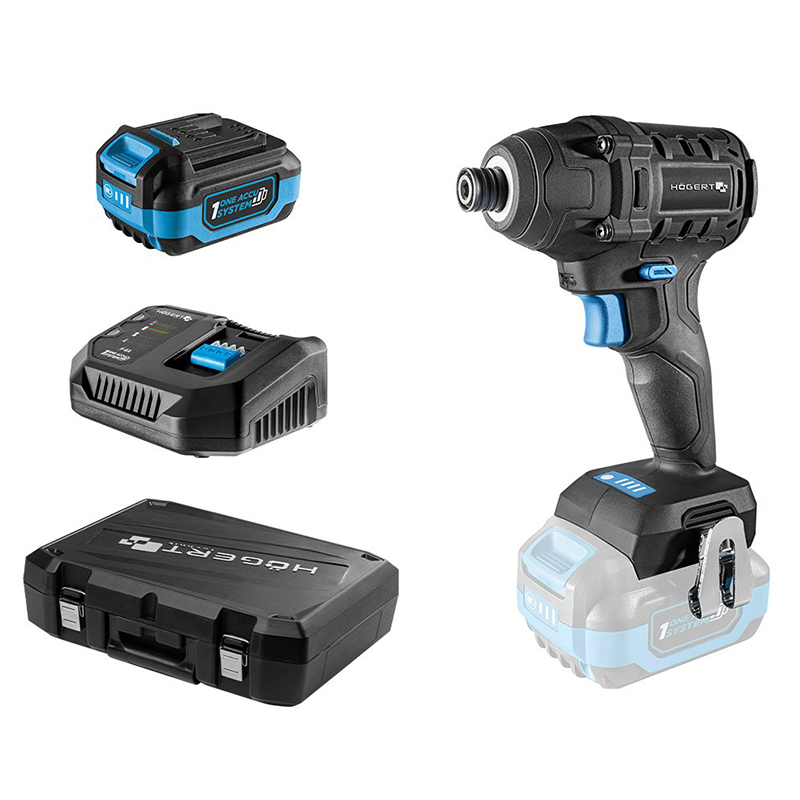 Набір Гвинтокрут безщітковий ударний імпульсний акумуляторний 200 Нм 18В + акумулятор 4Аг + акумулятор 2Аг + зарядний пристрій 4А + кейс HOEGERT 200 (HT2E255-B14ID-A20-PROMO)