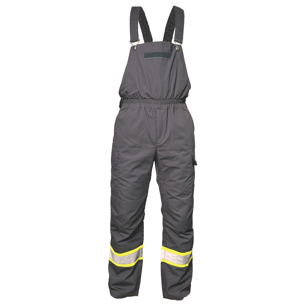 На рівні колін посилююча накладка. На задній половині посилююча накладка від лінії талії по шву сидіння. Бокові шви пристрочені двома строчками на яких розташовані бокові кишені. По передніх і задніх половинках під наколінником настрочені дві строчки, з контрастної тканини та світловідбивної стрічки. Низ штанів оброблений швом підглиб 2,5 см.