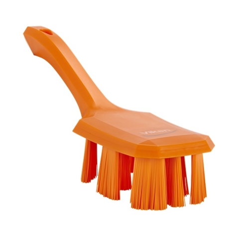 Щетка с короткой ручкой и жестким ультрагигиеничным ворсом UST. Повышенная прочность ворса обеспечивает высокое качество очистки конвейерных лент, станков и другого оборудования, а также столов для подготовки продуктов, где высок риск загрязнения. Все щетки UST имеют особый рисунок ворса, который минимизирует риск выпадения и попадания ворсинок в пищу.