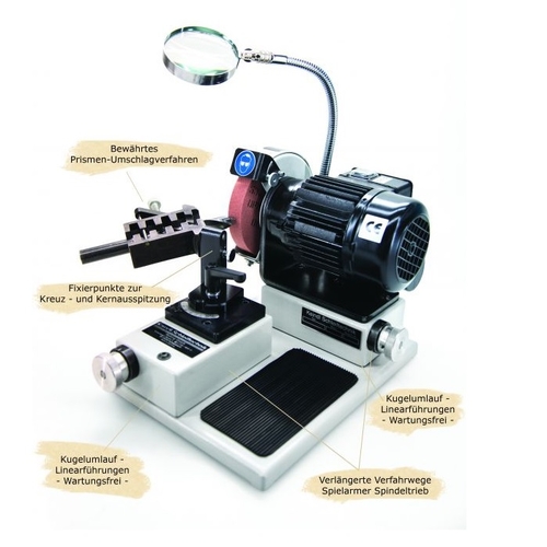 Станок BSG-20/2 предназначен для заточки различных типов сверл и некоторого специального осевого инструмента из быстрорежущей стали и твердого сплава. Станок BSG-20/2 обеспечивает хорошую точность и симметричность заточки сверла по задней грани обеспечивая конструктивно заданную затыловку и угол при вершине. Симметричная заточка сверл.