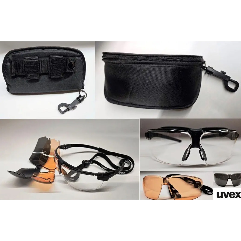 Комплект поставки: оправа uvex i-3, линзы (бесцветные, серые, оранжевые), шнур для очков, салфетка из микрофибры, футляр для очков с карабином (совместим с MOLLE/PALS).